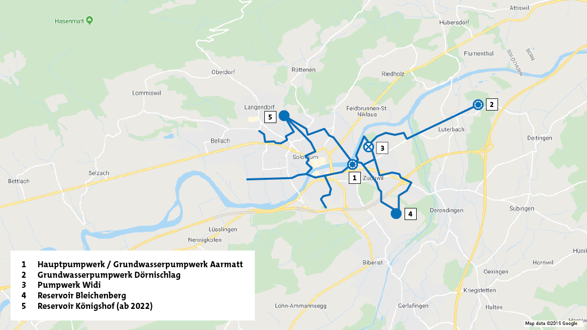 Das Hauptpumpwerk Aarmatt wurde 1976 erstellt. Die Speisung erfolgt von den Zubringer-Grundwasserpumpwerken Dörnischlag und Aarmatt. Pro Minute können maximal 20'000 Liter Wasser in das Solothurner Versorgungsnetz sowie 10'000 Liter in die Wasserversorgung Zuchwil gefördert werden.